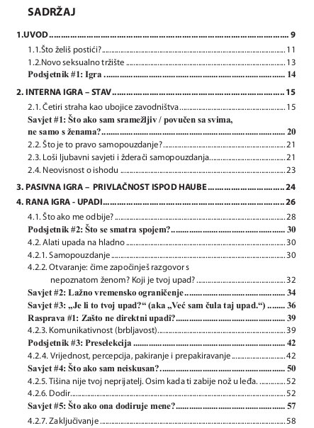 Iako autorov blog ima skoro pola tisuće članaka (od čega otprilike polovicu u obliku korisnih savjeta za muškarce) i lako bi sam ispunio jednu opsežnu monografiju, knjige “Umijeće igre” NIJE KOLEKCIJA ČLANAKA S BLOGA. Knjiga se sastoji velikom većinom od originalnog materijala pisanog tako da prilagodljivo prati prosječan tok zavođenja. Dijelovi preneseni s bloga – obrađeni, modificirani, uklopljeni u ostali materijal ili kopirani ako koncept apsolutno nije bilo moguće drukčije opisati – ne čine više od 25% knjige.